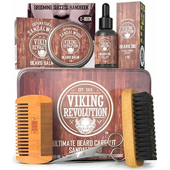 Viking Revolution Beard Grooming Kit for Men – Ultimate Beard Kit – Boar Beard Brush, Wood Beard Comb, Sandalwood Beard Balm, Sandalwood Beard Oil, Beard & Mustache Scissors
