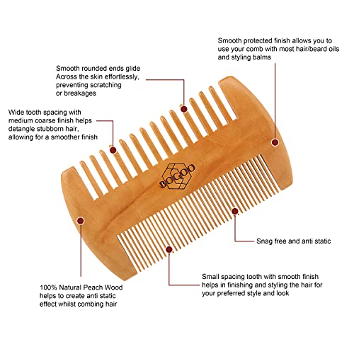 Beard, Moustache & Hair Wooden Comb with Leather Case – Wood Anti Static Pocket Size Comb – 100% Natural Peach Wood, Snag Free Grooming Mens Gifts