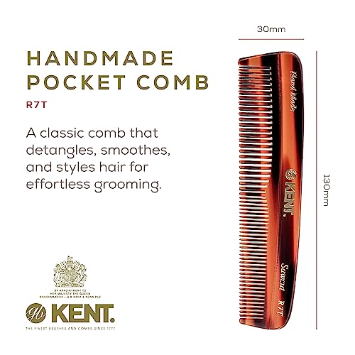 Kent R7T Fine and Wide Tooth Hair Comb, Handmade Pocket Comb for Men, Beard and Mustache Combs for Everyday Grooming and Styling, Sawcut Kent Combs, Made in England