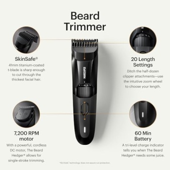 MANSCAPED® The Beard Hedger® Men’s Premium Beard Trimmer, 20 Length Adjustable Blade Wheel, Stainless Steel T-Blade for Precision Facial Hair Trimming, Cordless Waterproof Wet/Dry Clipper