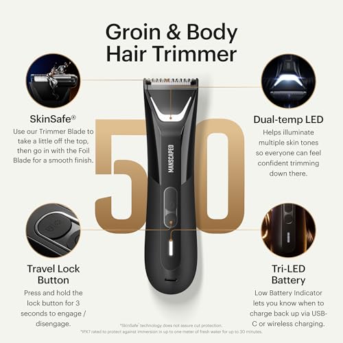 MANSCAPED® The Lawn Mower® 3.0 Plus Groin & Body Hair Trimmer – Updated SkinSafe® Trimmer Blade, Waterproof Wet/Dry Groomer, USB-C Rechargeable, Men’s Wireless Ball Shaver, Tuxedo Black