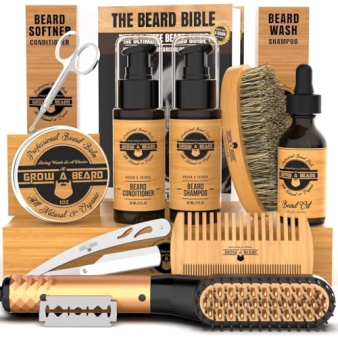 Beard Straightener Grooming Kit for Men, Beard Growth Kit, Wash, Brush & Comb, Unscented Growth Oil, All Natural Sandalwood Balm, Conditioner, Razor & Scissors, Great Gift Idea for Men’s (Bamboo)